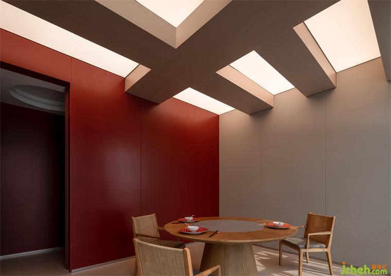 Up to the second floor, what comes into view first is the multifunctional area composed of the reception counter and water bar. The open terrace enjoys a pleasant ambiance. The contemporary geometric form above the bar counter contrast with the handmade rattan furniture and outdoor woven structures, creating a space atmosphere that encourages people to explore through the use of geometric symbols. The bold yet restrained design generates the collision between Eastern and Western aesthetics and philosophy.