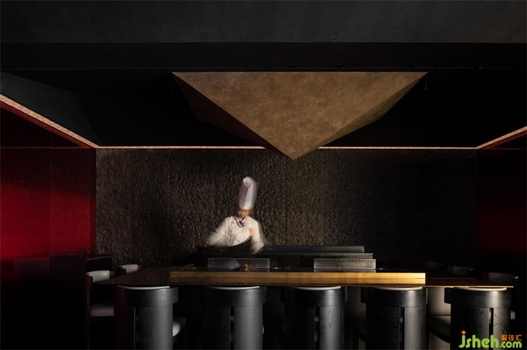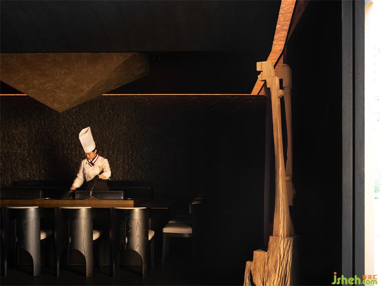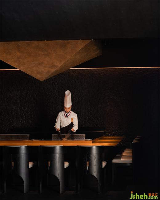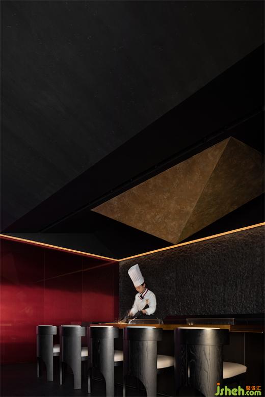 華燈初上,燈火一星一點(diǎn)亮了起來,門上的“虹”字LOGO面向燈火輝煌的商業(yè)區(qū),反射出燦燦金光;鐵板料理設(shè)計(jì)像是黑暗中出現(xiàn)火焰的光亮,影影灼灼,引導(dǎo)著尋訪來此的人;光影交落漸淡漸現(xiàn),又平添幾分望不穿的朦朧交織與神秘未來感,戶外就餐花箱區(qū)植被為產(chǎn)品動(dòng)線賦予氧氣。