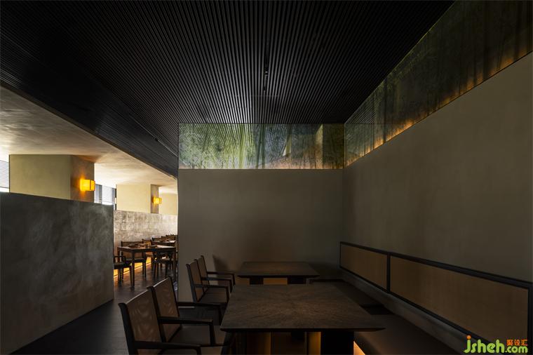 空間入口位于商場的戶外平臺,更好營造空間的街邊商業(yè)氛圍,讓二樓的空間植入一種新的錯(cuò)覺。餐廳設(shè)計(jì)在原先空蕩冰冷的平臺空間插入幾個(gè)矮墻,形成新的空間場域與空間溫度,讓客戶還沒進(jìn)入空間內(nèi)部就感受到玖五京菜對于自然,文化的傳承與包容。