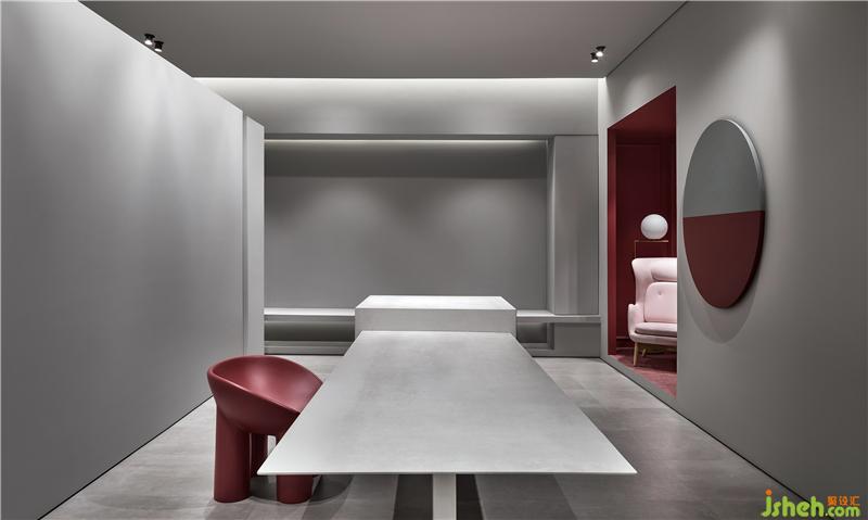 熱烈的紅色系填入內(nèi)嵌式的展示位,與素凈的家具形成冷暖對比,猶如電影鏡頭里的布景片段,卻又是真實可達(dá)的線下體驗區(qū)。