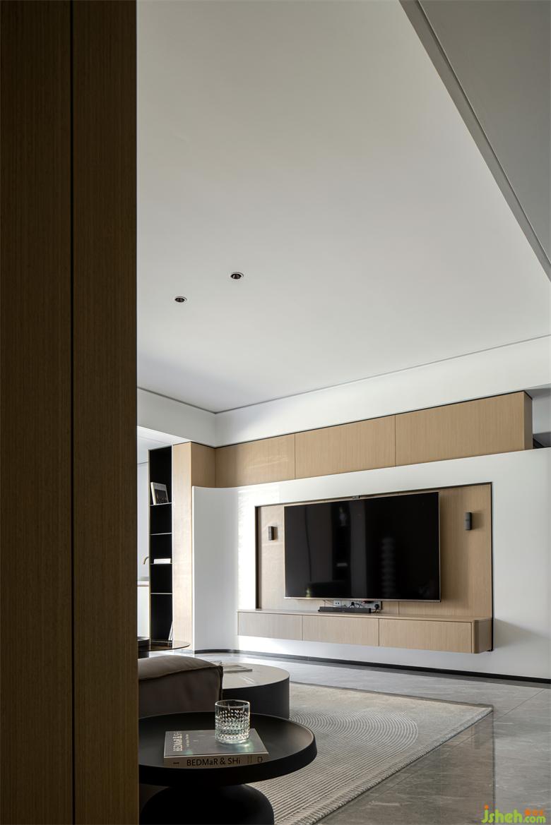 The blend of colors creates a unique space rhythm in the simple shape. The suspended TV cabinet and the background wall with great aesthetic temperament describe the vivid natural interest. The wood veneer and the white wall panel are spliced together, and the interface is softened with a delicate arc, guiding the line of sight to a more comfortable perception dimension.