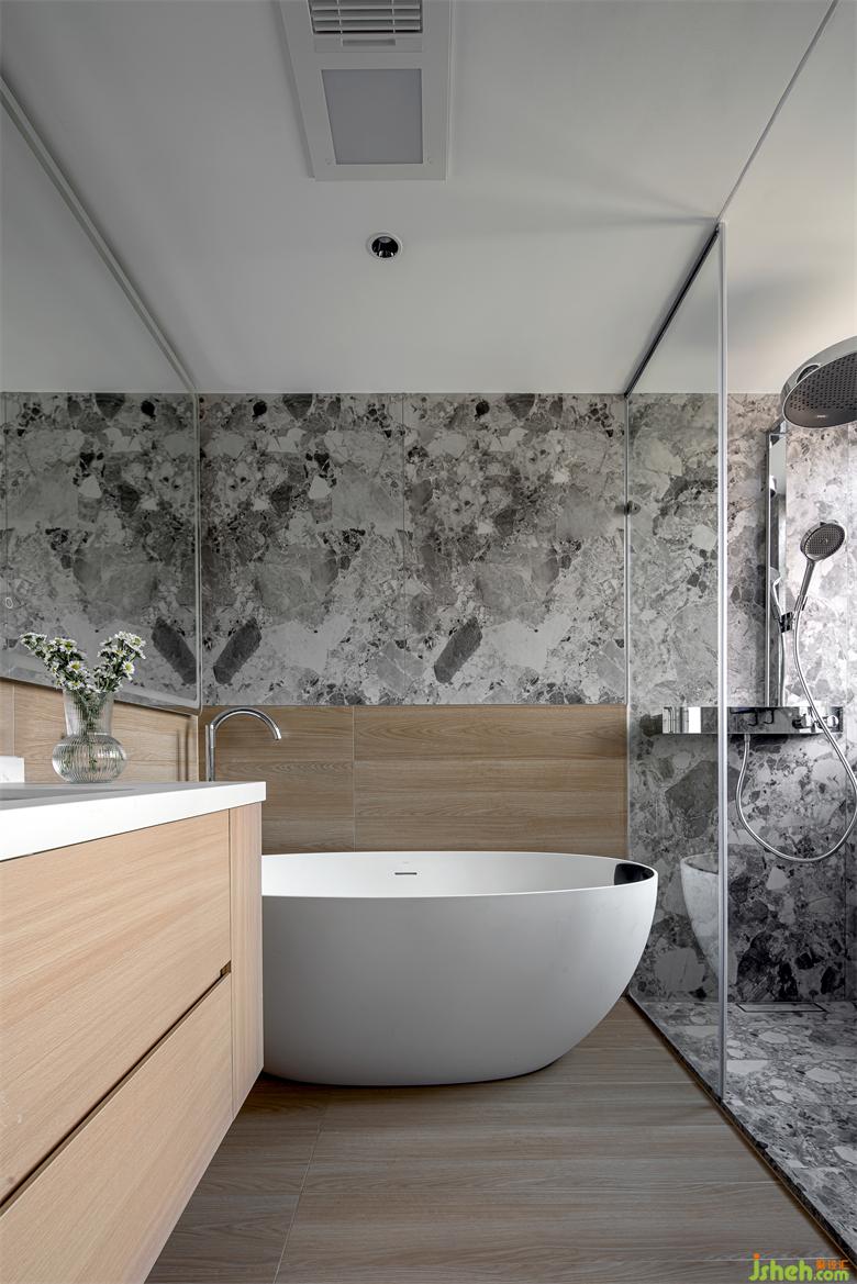 The concise and tense design language makes the main bathroom present a spacious, bright and clean space temperament. The application of log and slate elements echoes the overall layout of the space. The unique selection of materials and the sentimental bathtub bring higher enjoyment and fun to life.
