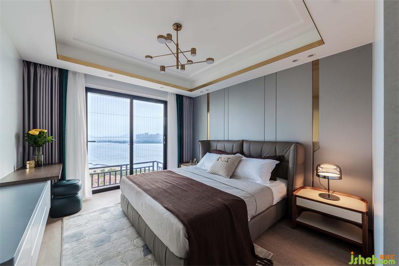 主臥淺灰色嵌上金色線條的背景墻,唯美的藝術(shù)吊燈,搭配墨綠色的窗簾及矮凳,散發(fā)出來充滿優(yōu)雅質(zhì)感,由內(nèi)而外散發(fā)出不可抗拒的魅力。