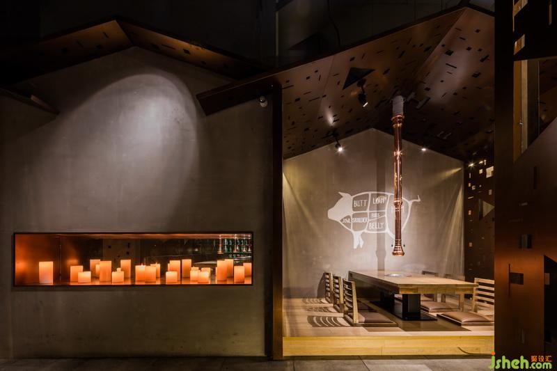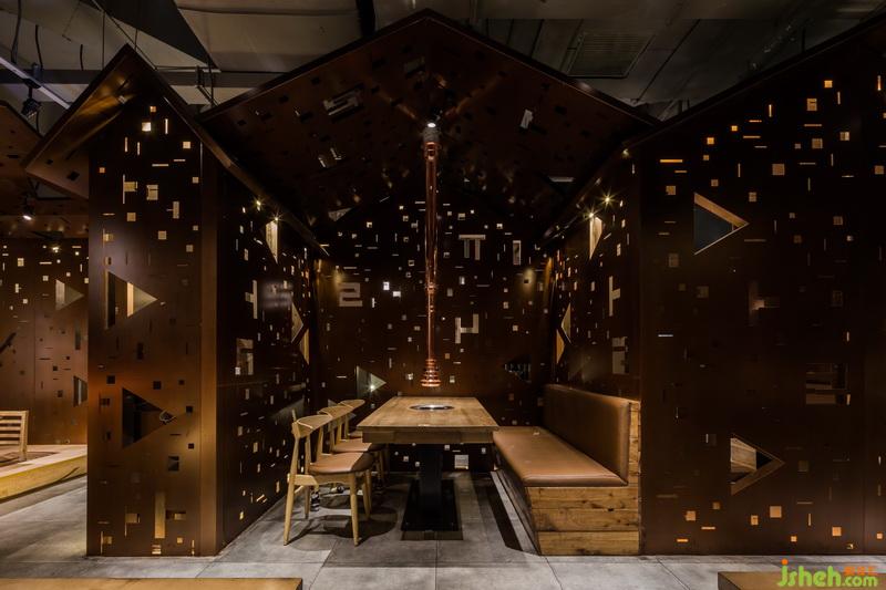 在這里,銹板和銹紅代表傳統(tǒng),水泥和灰色代表現(xiàn)代。這是時(shí)間的交疊。與烤肉不可分割的燒酒文化,以一道綠意晶瑩的酒墻出鏡。這就是文化的暗喻。