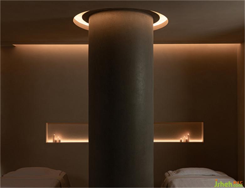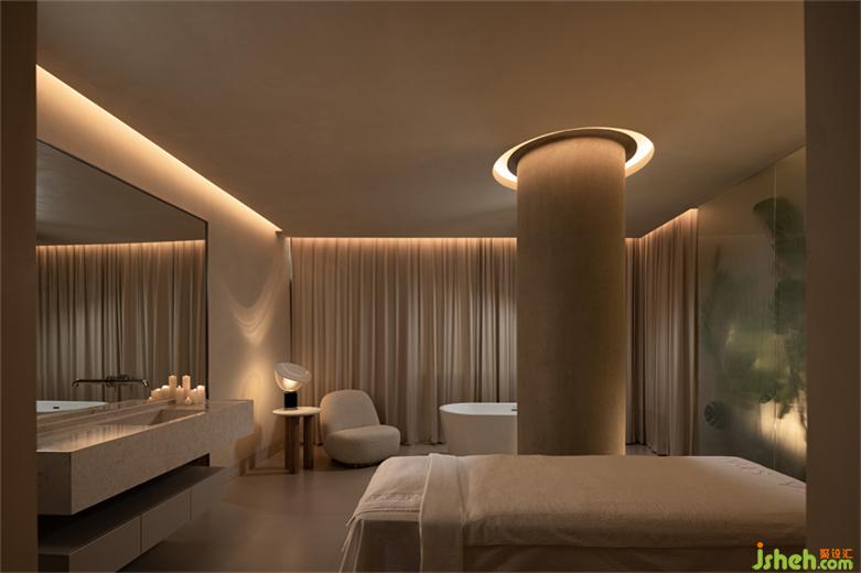 一束陽光穿過白色紗幔,融化在水霧之中,SPA設(shè)計將記憶拉回到那一方塵土。水晶磚、原木、原石、室內(nèi)留白和浮光掠影,讓空間無形中生出神性的侘寂之美。