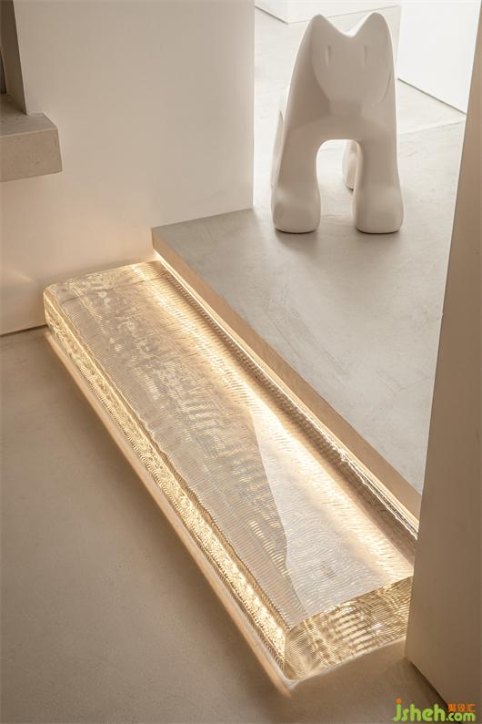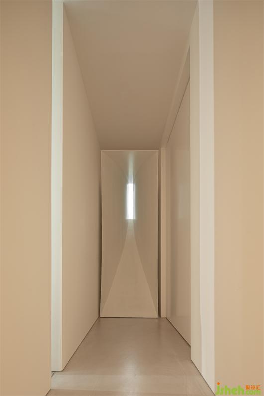 整個室內(nèi)所有布置都構(gòu)成一種既對立又統(tǒng)一的手法,客廳中沙發(fā)采用的是沙色麻料,茶幾則是黑胡桃與古銅的搭配,壁爐則以銅板鑲嵌,書房金屬書架彰顯著品質(zhì)感。展廳設(shè)計在清水混凝土的底調(diào)下,所有的物品都有著各自的性格和特色。