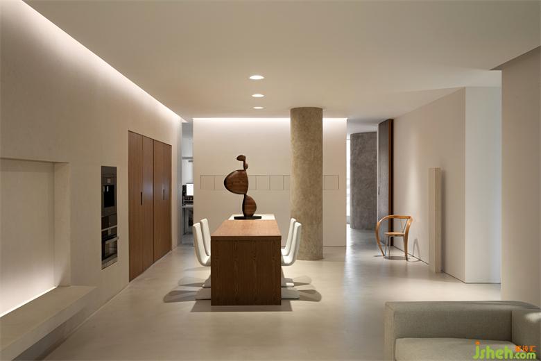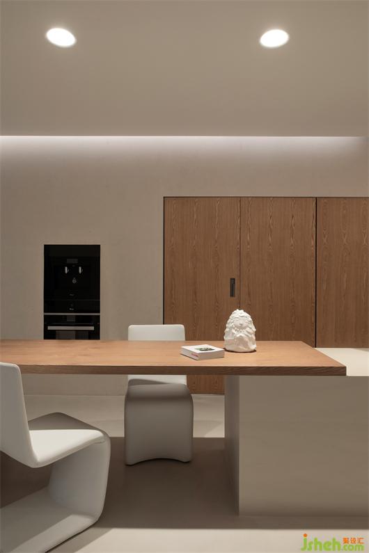 寬敞明亮的開放式廚房也很有藝術(shù)氣息,原木與水泥組合的定制吧臺、整體隱藏式櫥柜、以及白色餐椅讓整個空間變得極簡大氣,極度舒適溫馨。