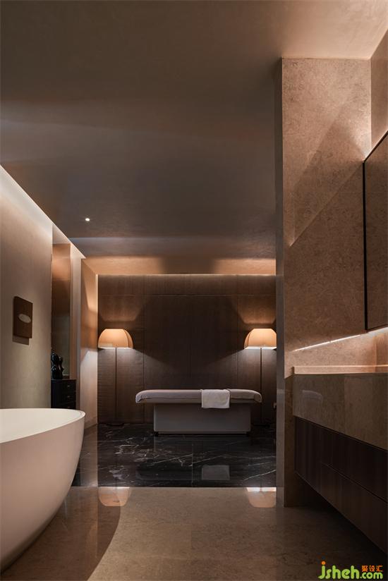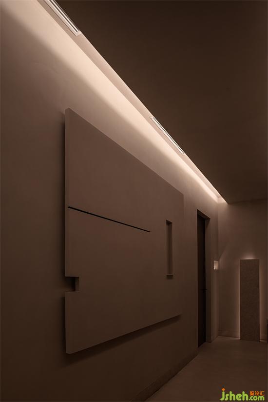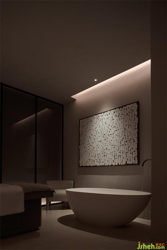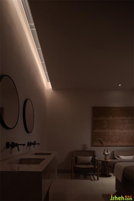 藝術(shù)的魅力在于克制與平衡,設(shè)計(jì)也一樣,需要在多與少之間做選擇與變化。O.GO SPA項(xiàng)目中設(shè)谷主要用了兩種建筑材料,墻面的肌理涂料和地面的微水泥,希望通過建筑材料的微妙變化,結(jié)合空間形體和燈光引起我們的聯(lián)想,讓我們聚焦于空間SPA設(shè)計(jì)本身。