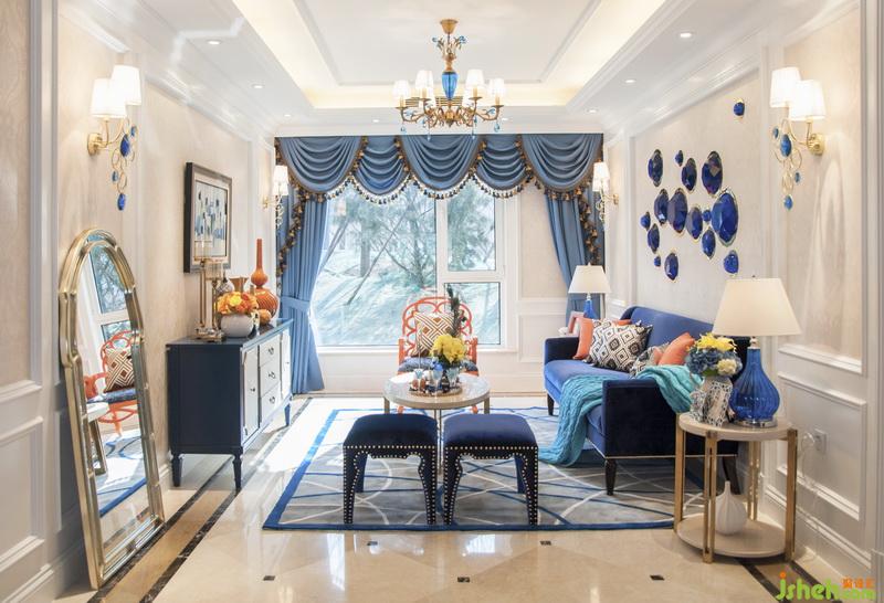 設(shè)計(jì)風(fēng)格上以現(xiàn)代美式風(fēng)格為主。整體空間上以中世紀(jì)藍(lán)為主調(diào)。中世紀(jì)藍(lán)(Medieval Blue)——來(lái)自于歐洲中世紀(jì)時(shí)期使用的自然染料,高質(zhì)量的深天藍(lán)色織物工藝繁復(fù)且非常昂貴,是屬于貴族身份象征的顏色之一。當(dāng)中世紀(jì)藍(lán)入住家居,這個(gè)充滿(mǎn)張力的藍(lán)色能夠烘托空間氣氛,猶如一幅靜謐畫(huà)作,完美演繹出優(yōu)雅大氣的貴族氣質(zhì)??臻g設(shè)計(jì)從入口過(guò)道到每個(gè)獨(dú)立的房間都遵循著整體而又各自獨(dú)具空間個(gè)性的空間美學(xué)原則,通過(guò)精致而豐富的細(xì)節(jié),在色彩上通過(guò)對(duì)對(duì)比以及類(lèi)比色的運(yùn)用,以及對(duì)材質(zhì)不用表現(xiàn)形式的運(yùn)用,意在用顏色和質(zhì)感提升空間美學(xué)氣質(zhì),同時(shí)給客戶(hù)留下一個(gè)尊貴,玩味,而又富有張力的樣板房體驗(yàn)感受。