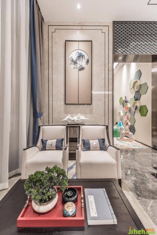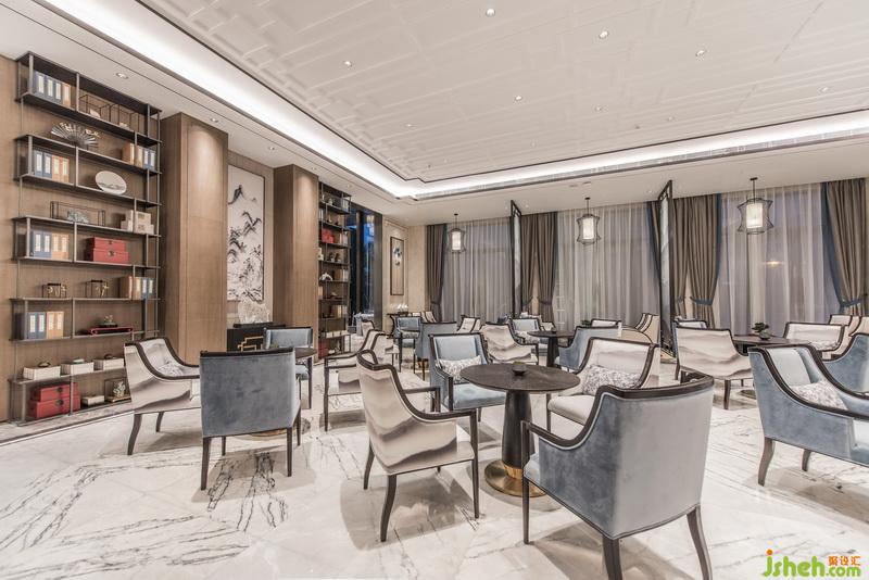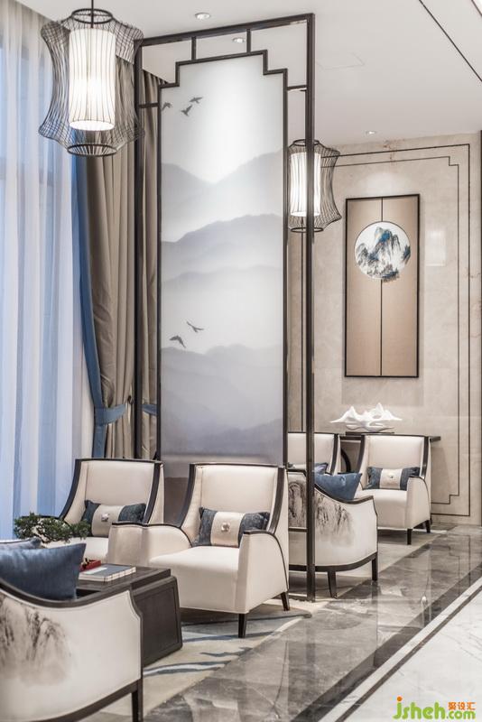 而洽談區(qū)藍白相間的洽談椅靈感來源于這座城市被低山丘陵包圍獨特的地貌,高級定制的水墨山紋與面料與水墨藍的凈色面料相搭配,意在營造一個藍天白云,好山好水的中式閑適意境空間,給人一種山水景色的帶入感。