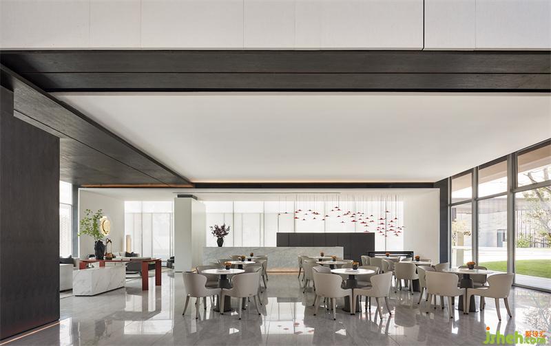 園林的湖水化作一簾紅雨,售樓處設計傳統(tǒng)與現(xiàn)代靜默交織,為素雅的空間增添靈動之感,讓人在自然行進之中,感悟藝術心境。