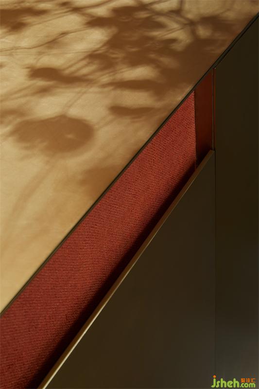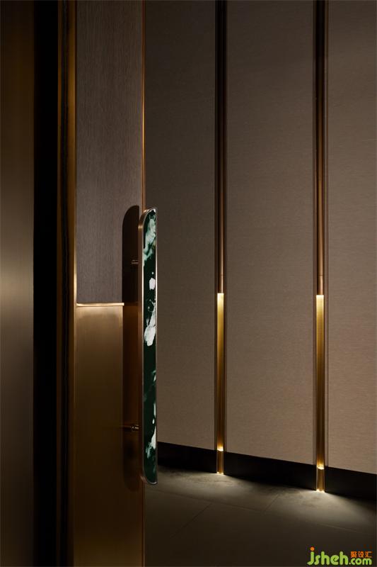 入電梯廳,白青色的夾絲玻璃呈現(xiàn)玉面的質(zhì)感,來自空間兩端的紅色肌理墻,透過漫反射暈染著電梯廳的每一處角落。四根金色立柱從地面延伸至鏡面的天花,與金屬網(wǎng)框交織,無限延展,循環(huán)往復(fù),無盡空間。