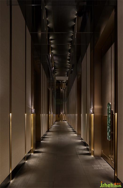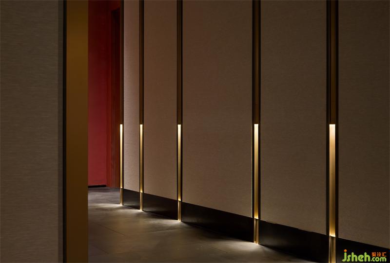局部展露的服務(wù)臺暗示了下一個(gè)空間,形體由金屬塑造包裹的墻壁,完成“形”與“間”虛實(shí)轉(zhuǎn)換,自然過渡。從接待廳行進(jìn)至包廂走廊,依然由三個(gè)空間組成,循序漸進(jìn),空間尺度依次遞減,照度逐步降低,旋律漸漸平緩,遠(yuǎn)離喧囂,回歸寧靜。