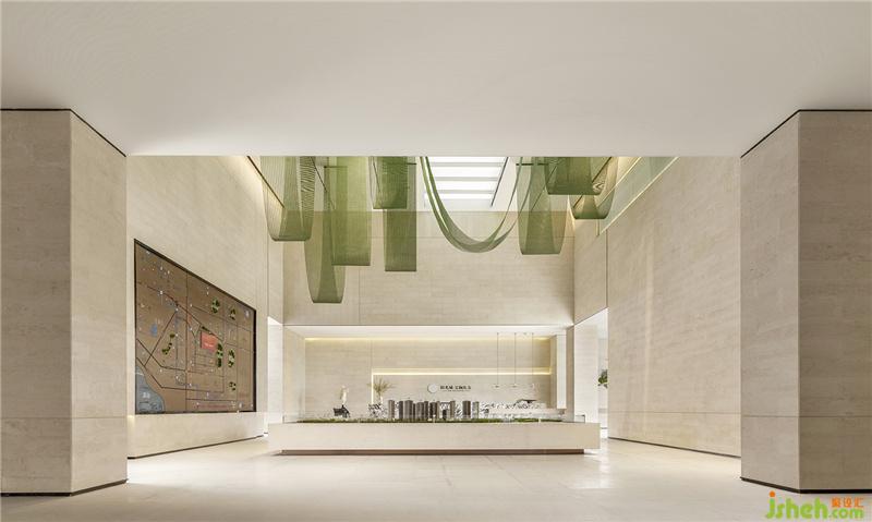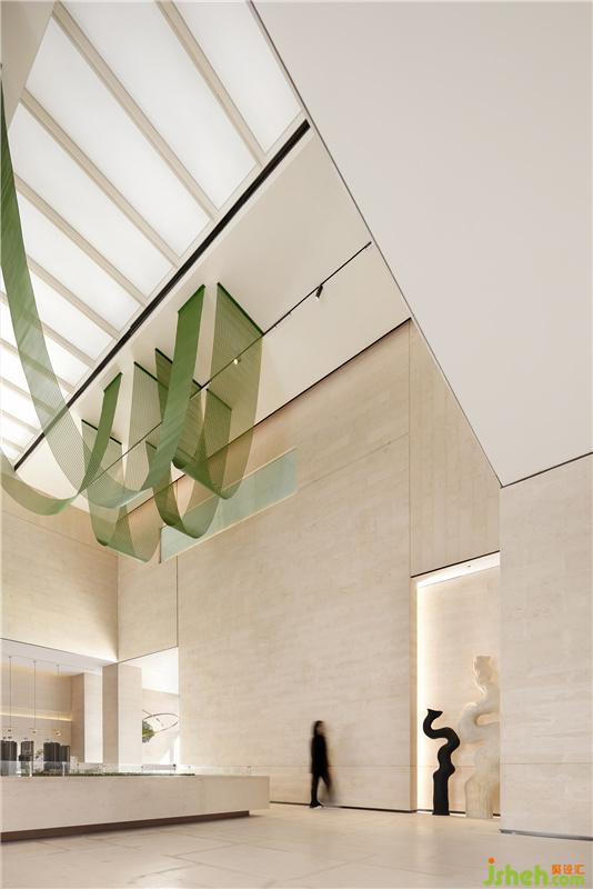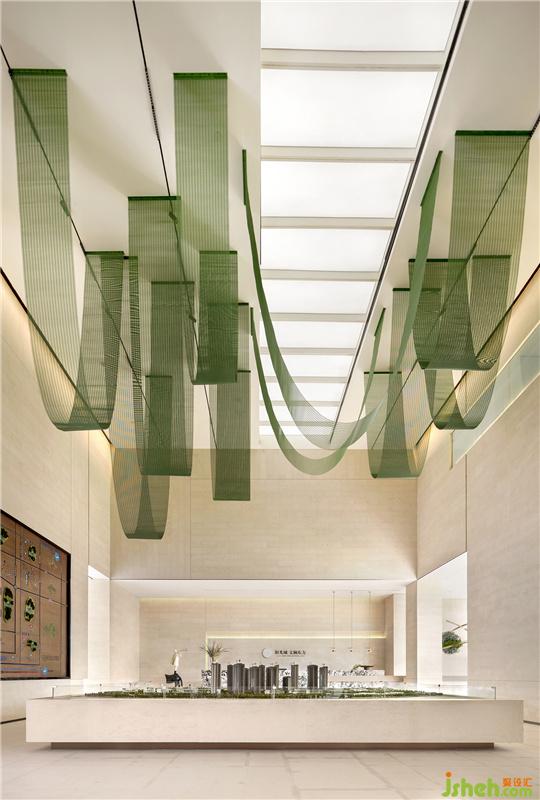 城市脈絡(luò),敘事的美感源于裝置和藝術(shù)品點(diǎn)綴,從客觀實(shí)體的物質(zhì)性到使用者接觸與使用界面,綠色和米黃色的空間朦朧穿梭為整體的敘述核心,將山體的形態(tài)抽象至空間之中,豐富了空間的形態(tài)并為人與景增添了多元的互動(dòng)可能。