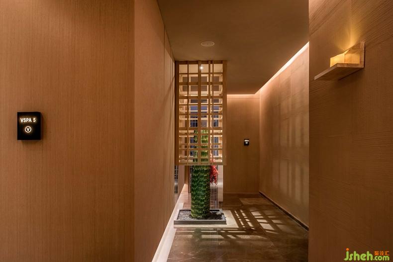 通往SPA區(qū)的廊道與前廳用4扇自動木格柵門連接,走廊墻壁上燭火搖曳,似有風(fēng)從盡頭而來,柔和的燈光穿過寬窄不一的木格柵,光影交錯,讓人一眼望不真切。