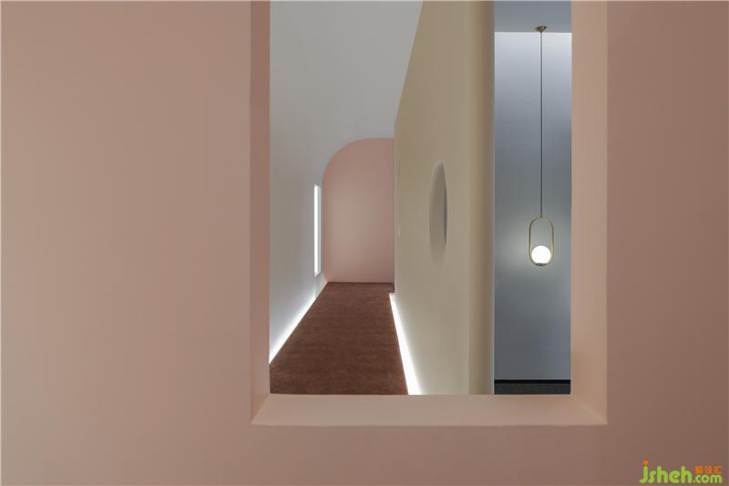 踏上廊道,讓人對下一個展示區(qū)充滿期待,它的底打光直至半弧的天花,柔和而夢幻,行走的途中可以在窗口回望、招呼,讓人與人、人與空間互動,家具展廳設(shè)計空間變得更有趣了。