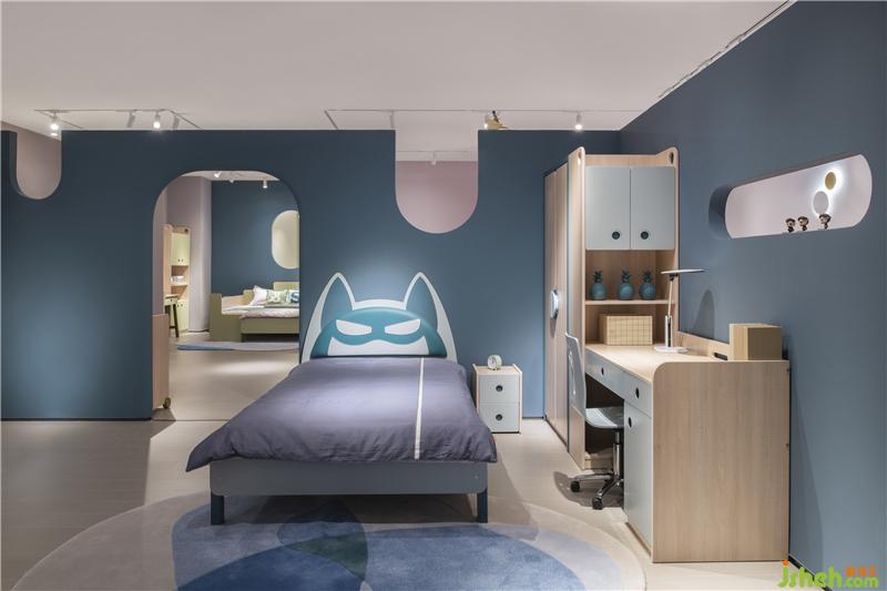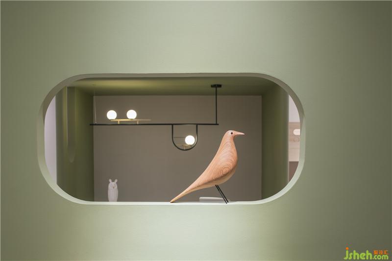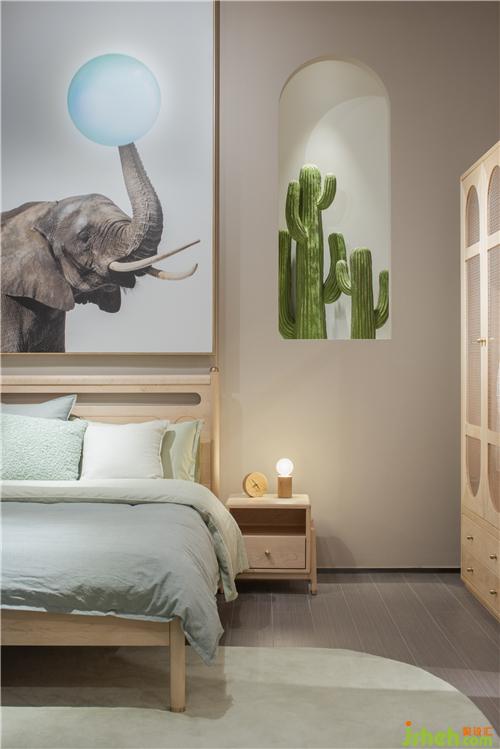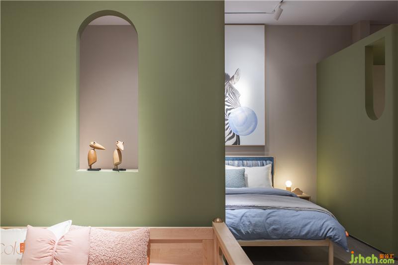 穿過(guò)床墊區(qū)可見(jiàn)一柔和氛圍,這便是原木家具展區(qū),原木有著天然的親和力與溫潤(rùn)的質(zhì)感,墻身選用象牙色讓空間變得安靜,枯綠色的雕塑墻豐富了空間層次,配上俏皮可愛(ài)的動(dòng)物畫(huà)、動(dòng)物小木偶,家具展廳設(shè)計(jì)讓寧?kù)o而輕松的空間氛圍添了幾分童趣。