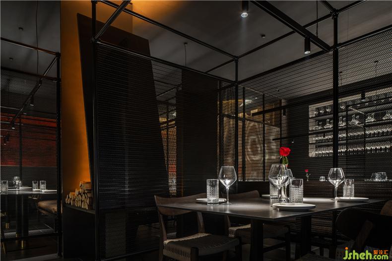 餐廳內(nèi)被黑色鋼網(wǎng)分割出一個個小空間,遮蔽視線,保護(hù)隱私,但因為鋼網(wǎng)的透氣感,并不顯得沉悶壓抑,搭配柔和的燈光,反而像是披上黑色薄紗般,朦朦朧朧,欲遮還羞。