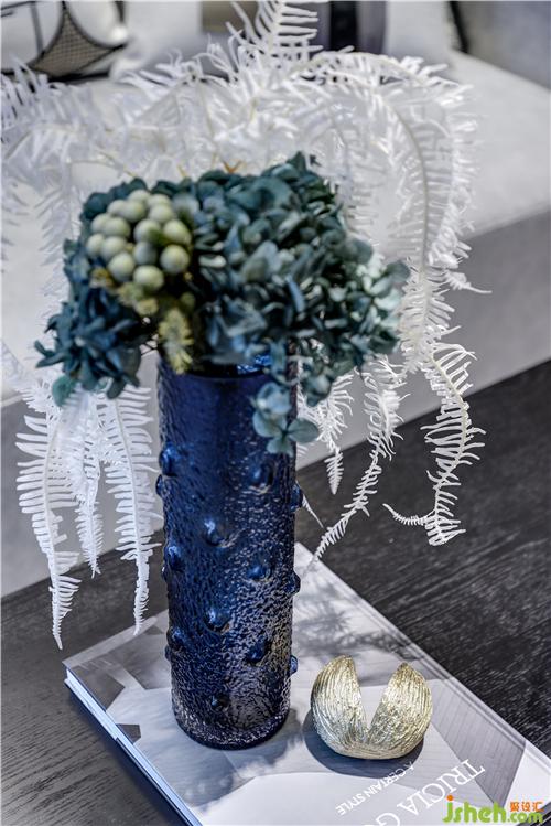 以深灰、淺灰、藍、白的家飾交相疊印