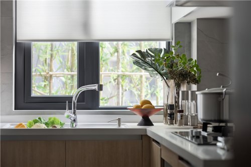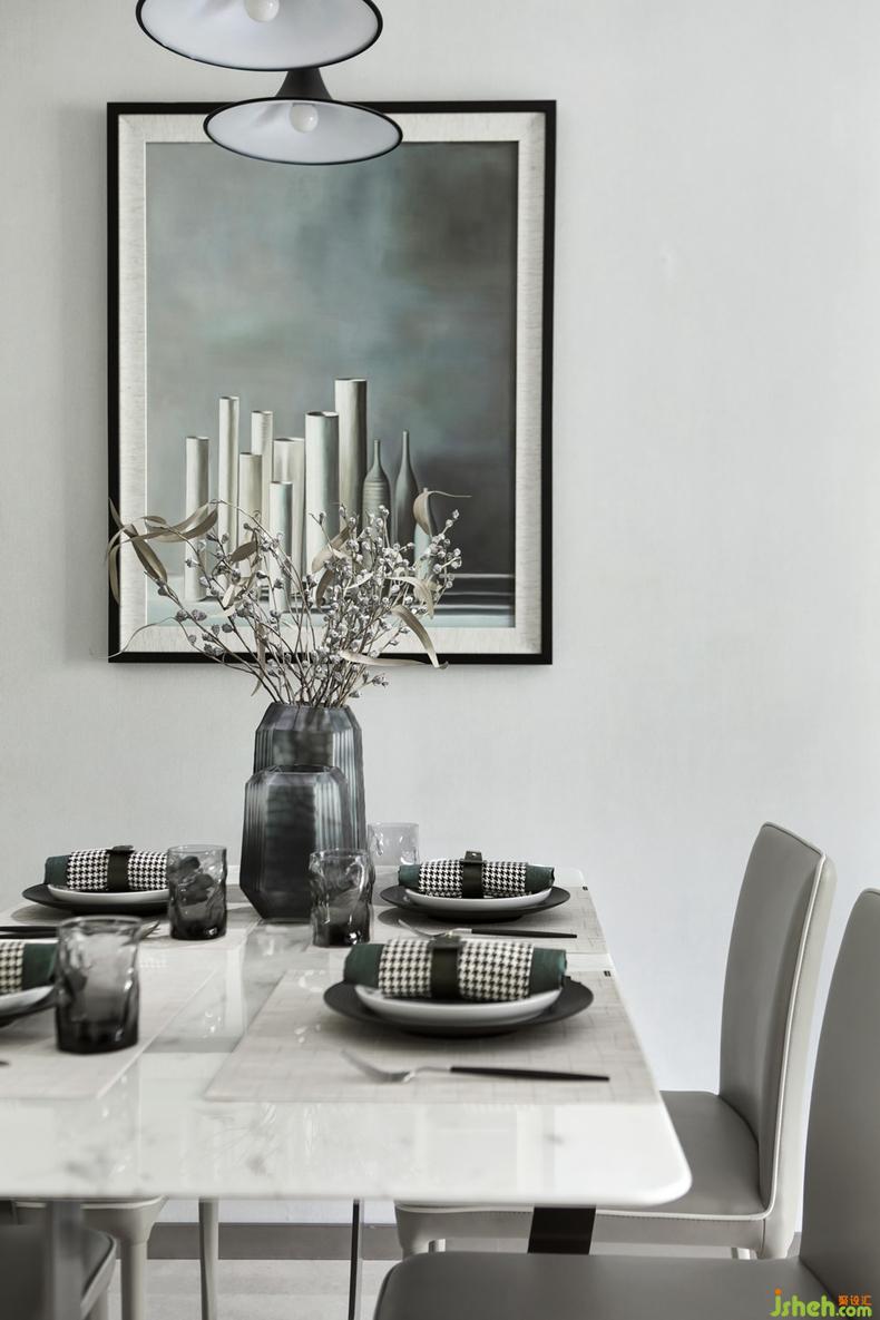 餐廳中央吊一盞特色的吊燈,營造出柔和燈光效果,各類飾品亦為這個空間注入個性化情趣,兼有客廳大理石地面干凈大氣的統(tǒng)一布局,使空間通透感和層次感更明顯。綠色象征著生命代表著健康,熱愛美食的主人可以充分享受這一空間。