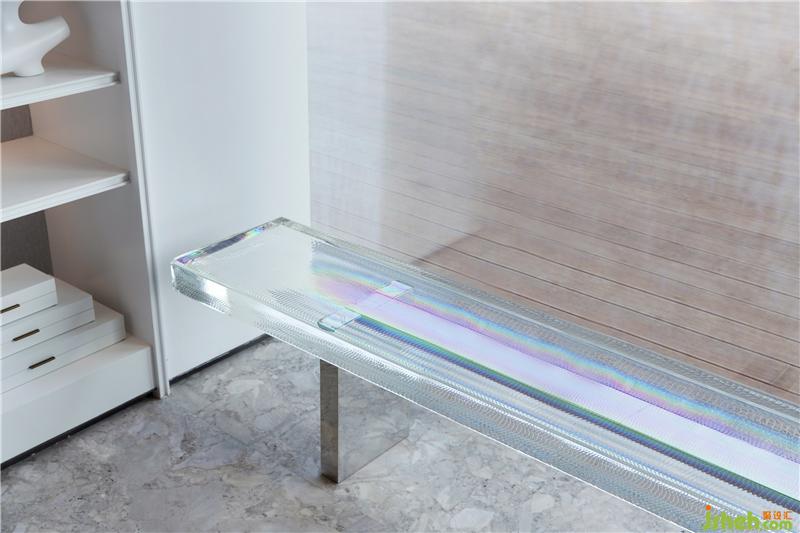 藝術(shù)是豐盈詩意的,而藝術(shù)孕育的過程是漫長的,一如鳳凰浴火,方能涅槃新生。二十多天的錘煉,才等到鋼化玻璃最終鍛造出水紋的天然紋理,反射出七彩陽光。一燈一椅,從平面變成立體,從想象成為現(xiàn)實(shí),皆是身為設(shè)計(jì)者的歡喜。
