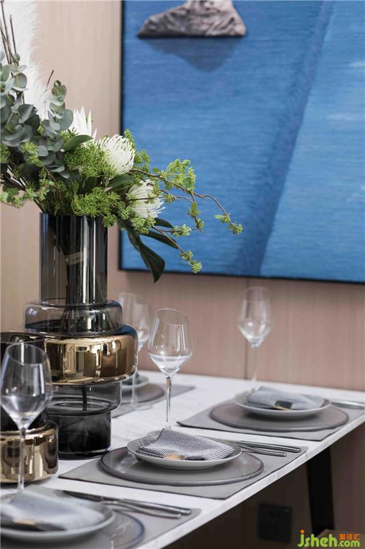 餐廳空間內(nèi),設(shè)計師用簡單符號化的裝飾品注解生活,詮釋著“功不求盈,業(yè)不求滿,花看半開時,酒飲微醉處”的設(shè)計理念。