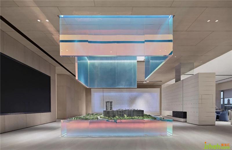 沙盤造型如一個(gè)流動(dòng)變化的魔方,透光罩為幻彩亞克力材質(zhì),其隨觀者視線流轉(zhuǎn)而變換的豐富色彩,進(jìn)一步提升空靈意境,藝術(shù)質(zhì)感的格調(diào)躍然而出。