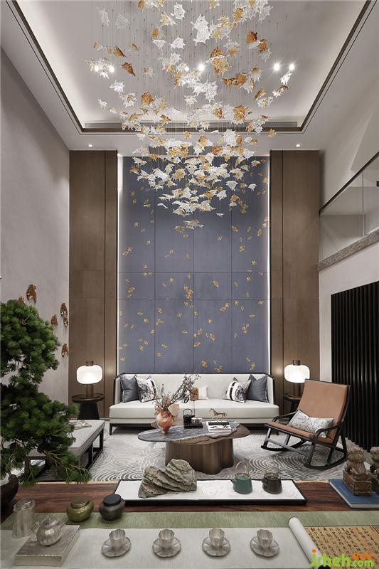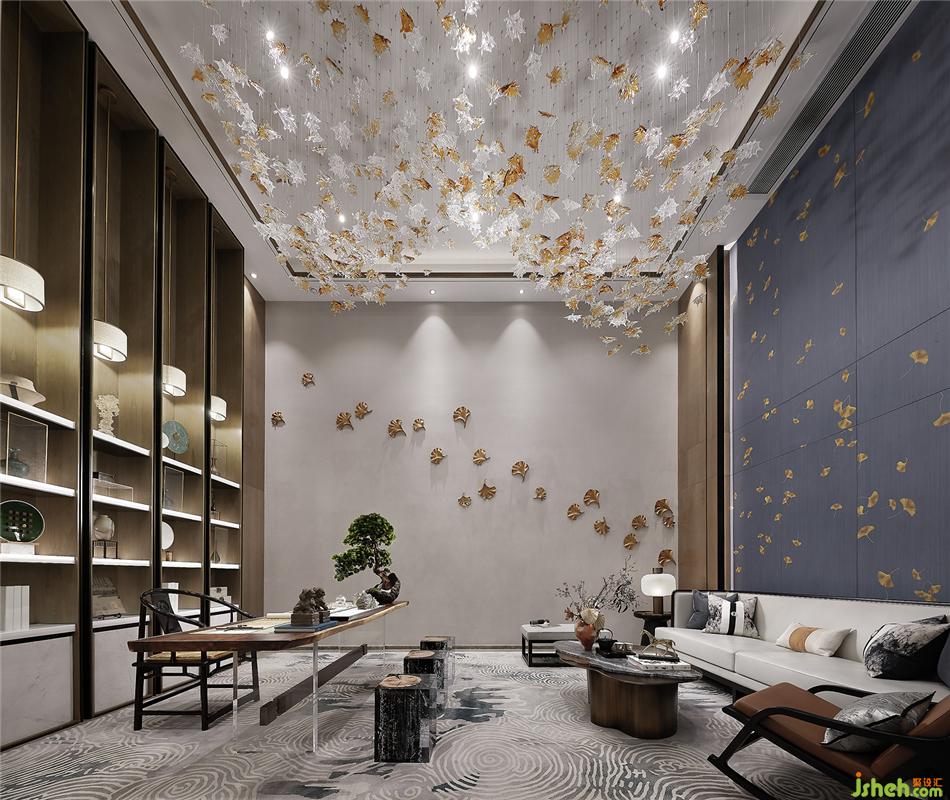 茶室的設(shè)計(jì)集休閑與禪意一體。天花的藝術(shù)裝置采用了象征著鴻運(yùn)、溫情、自然的楓葉為造型,為空間增添了一分擁抱自然、天然去雕飾的獨(dú)特氣質(zhì)。