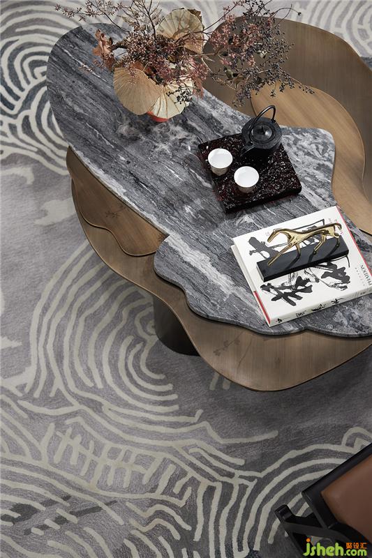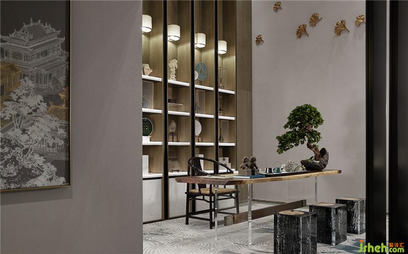 茶臺(tái)上小型松樹盆景橫挑構(gòu)成形態(tài)之美,賦予空間生命力,讓韻味典雅的東方禪意躍然于眼前。