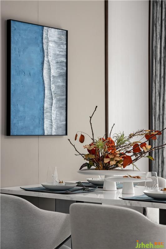背景墻上的裝飾畫(huà)含蓄而澄凈,而畫(huà)上一抹頗具風(fēng)姿的孔雀藍(lán)也為空間增添了無(wú)限詩(shī)意,既與沙發(fā)上的抱枕在色彩上相互呼應(yīng),又與整體空間相宜得章,豐富了空間的畫(huà)面感,提升了空間的藝術(shù)格調(diào)。