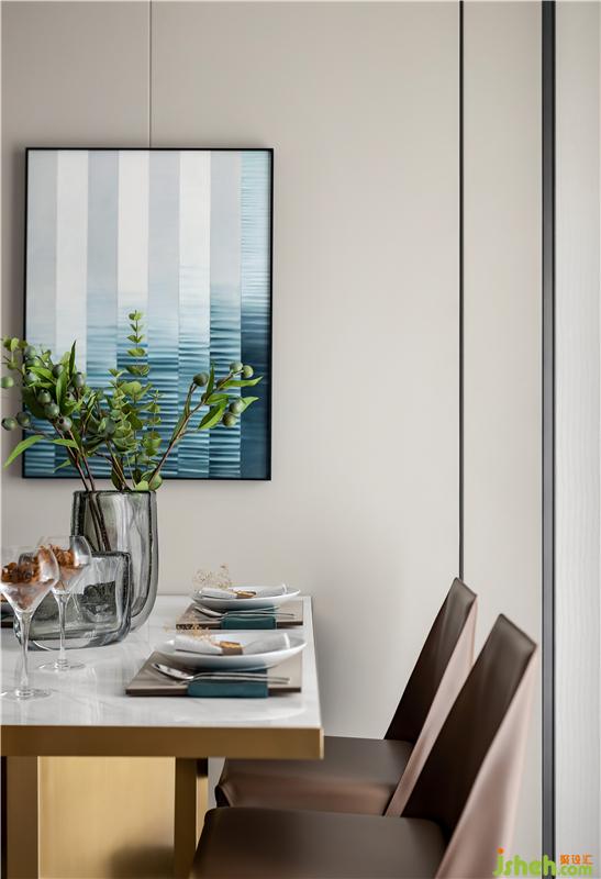餐椅皮革的質(zhì)感與空間協(xié)調(diào)又平衡,裝飾畫宛如流水般漸變的色彩與曲折的弧度青寧而澄凈。