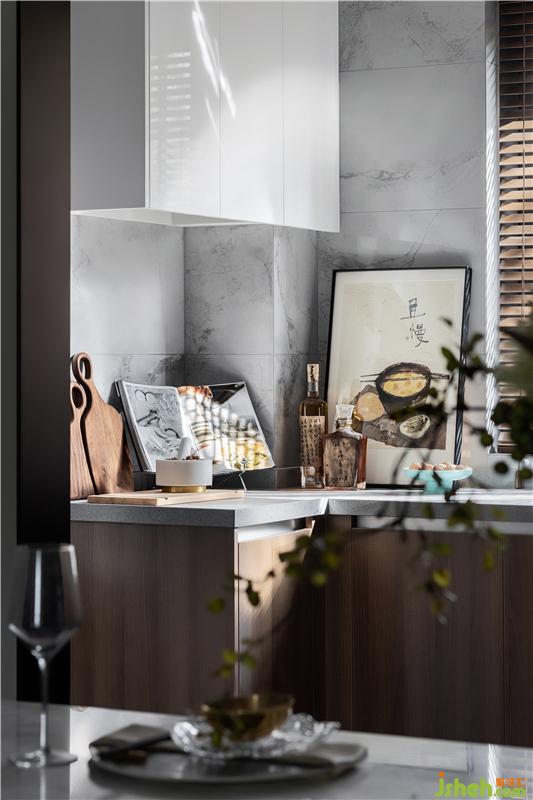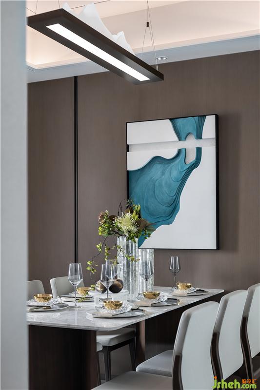 吊燈如綿延起伏的山巒,造型創(chuàng)意十足,長沙樣板房設(shè)計裝飾畫好似碧波輕漾,泛起一池漣漪,精致整齊的餐具,簡約雅致的餐椅,餐廳與廚房里的每一處每一物,都在用他們獨有的材質(zhì)和色彩,訴說著關(guān)于家故事。