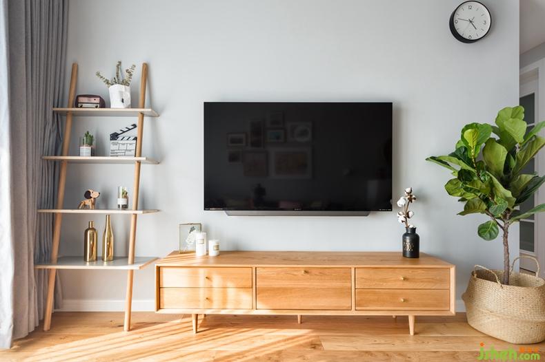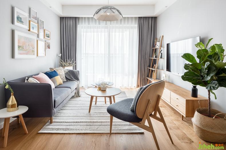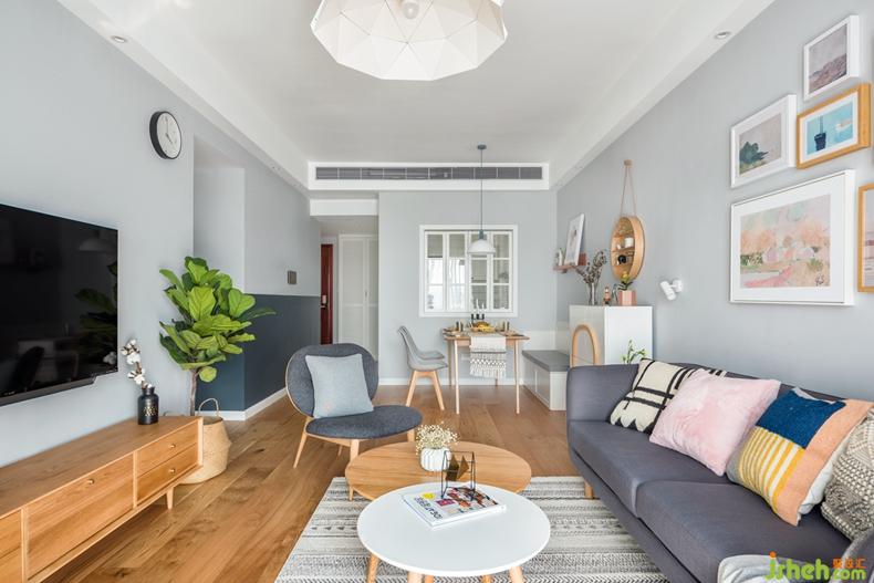 以白色和原木色打底,搭配深深淺淺的灰色穿插在空間里,通過抱枕和掛畫的色彩及幾何圖案點亮空間表情,不多不少,恰到好處。