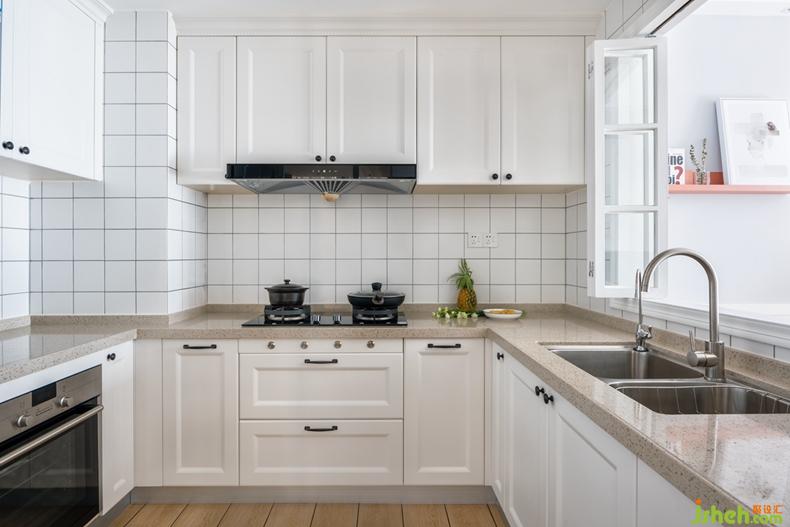 搭配拓展后的廚房由原來的L型變成了U型,滿足了各種功能和操作上的需求,考慮到廚房的采光,我們選擇了白色系,干凈整潔。