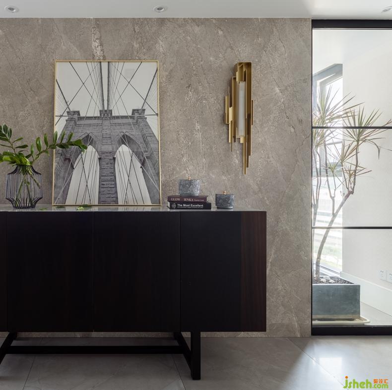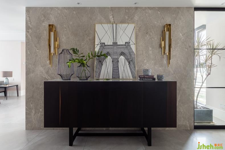 一進(jìn)門,首先引入眼簾的,便是方正的門廳,極具質(zhì)感的大理石墻面,大氣穩(wěn)重的邊柜,金屬邊框的建筑攝影畫,隨眼可見的質(zhì)感在低調(diào)的展示著。室內(nèi)設(shè)計(jì)師