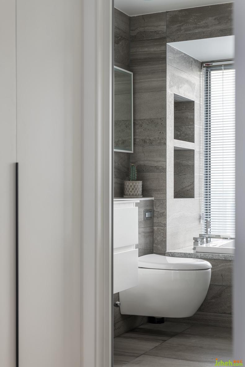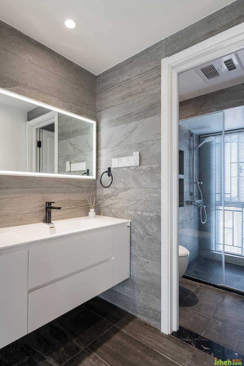設(shè)計師開放公共衛(wèi)生間的洗手臺區(qū)域,與懸掛馬桶和淋浴間區(qū)分開來是為了調(diào)整狹長的過道空間,與過道區(qū)域共享。室內(nèi)設(shè)計師