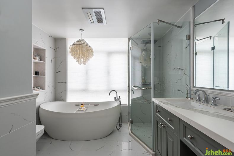 大理石紋理的墻面/流暢曲線的獨立浴缸/線條感十足的馬桶/,衛(wèi)生間的Houzz感低調(diào)又耐看。點上香薰,水面映射造型燈顯得波光粼粼,小細節(jié)提高生活的格調(diào)。
