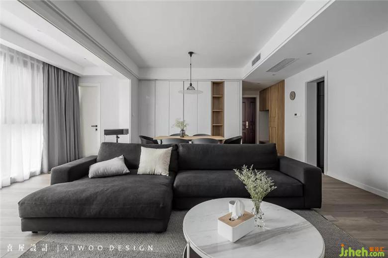 傳統(tǒng)簡約風(fēng)格的室內(nèi)設(shè)計大多以黑白灰為主,要打破傳統(tǒng)并保留溫度,需要裝修公司運用色彩元素的技巧。深色沙發(fā)、黑色餐椅、白色墻面、木色柜體、窗簾等色彩語素使整個空間達(dá)到溫暖的簡約恬靜。