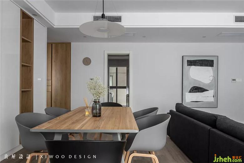 餐廳是一個充滿溫度的地方,利用墻面做成滿墻的儲物柜,在收納上也要做到強(qiáng)大和至簡。