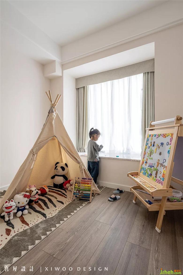 兒童房搭配淺雅而溫和的奶油粉,恰如健康肌膚的自然底色。頂面邊沿處的疊級(jí)線條躍然其上,好似用心勾勒的眉眼細(xì)節(jié),使空間呈現(xiàn)出清透怡然的裸妝效果。