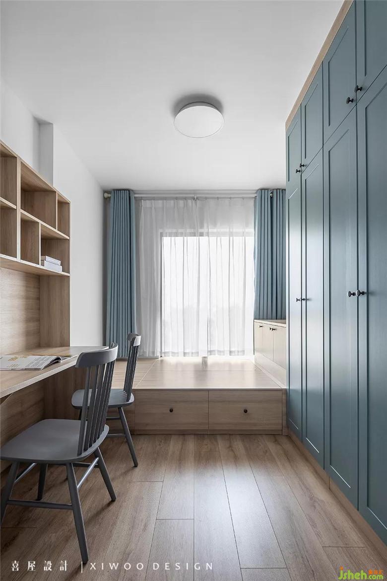 男孩房整體布局呈U型狀,選擇儲(chǔ)物和寢居功能為一體的榻榻米形式,與整體衣柜形成一個(gè)靈動(dòng)活潑的藍(lán)色整合體。大書桌前,哥哥耐心的為妹妹講著藍(lán)胖子與大熊的故事。隨著時(shí)間的運(yùn)行不斷變化,他們逐漸長大,這種空間的經(jīng)驗(yàn)與記憶也會(huì)漸漸成為他們童年的回憶。
