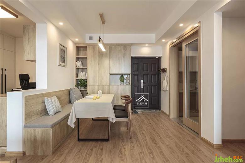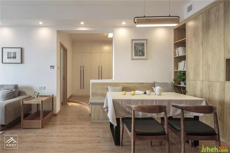 入戶右邊一排鞋柜和餐邊柜,隔板的設(shè)計是與卡座收口更好的處理方式。中空的設(shè)計能隨手放鑰匙、可視電話等小物件。就如同放下了手中的羈絆,打開家門的那一刻,就是暖暖。