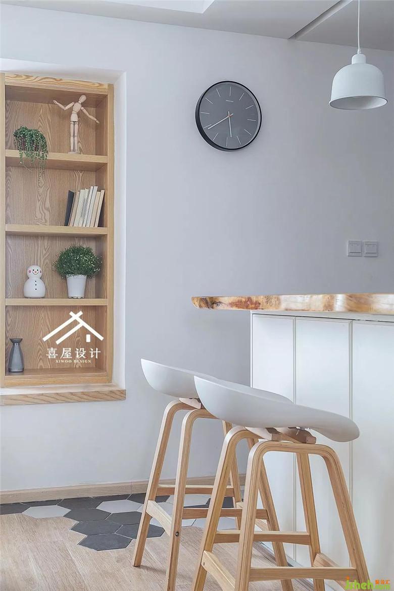 吧臺做了實木自然原邊,更自然,廚房的地磚和客廳用了硬拼的方式,地板下面墊了木工板,這樣的牢固一如幸福的遠景。