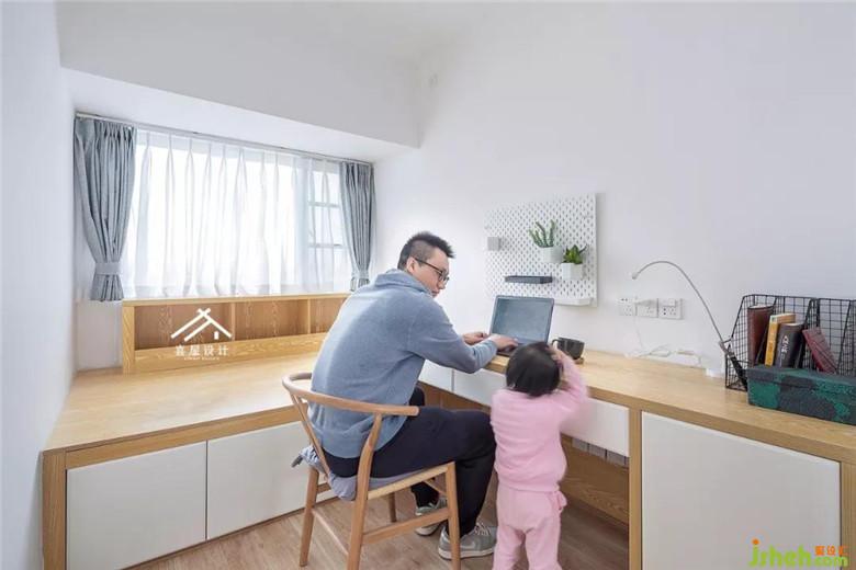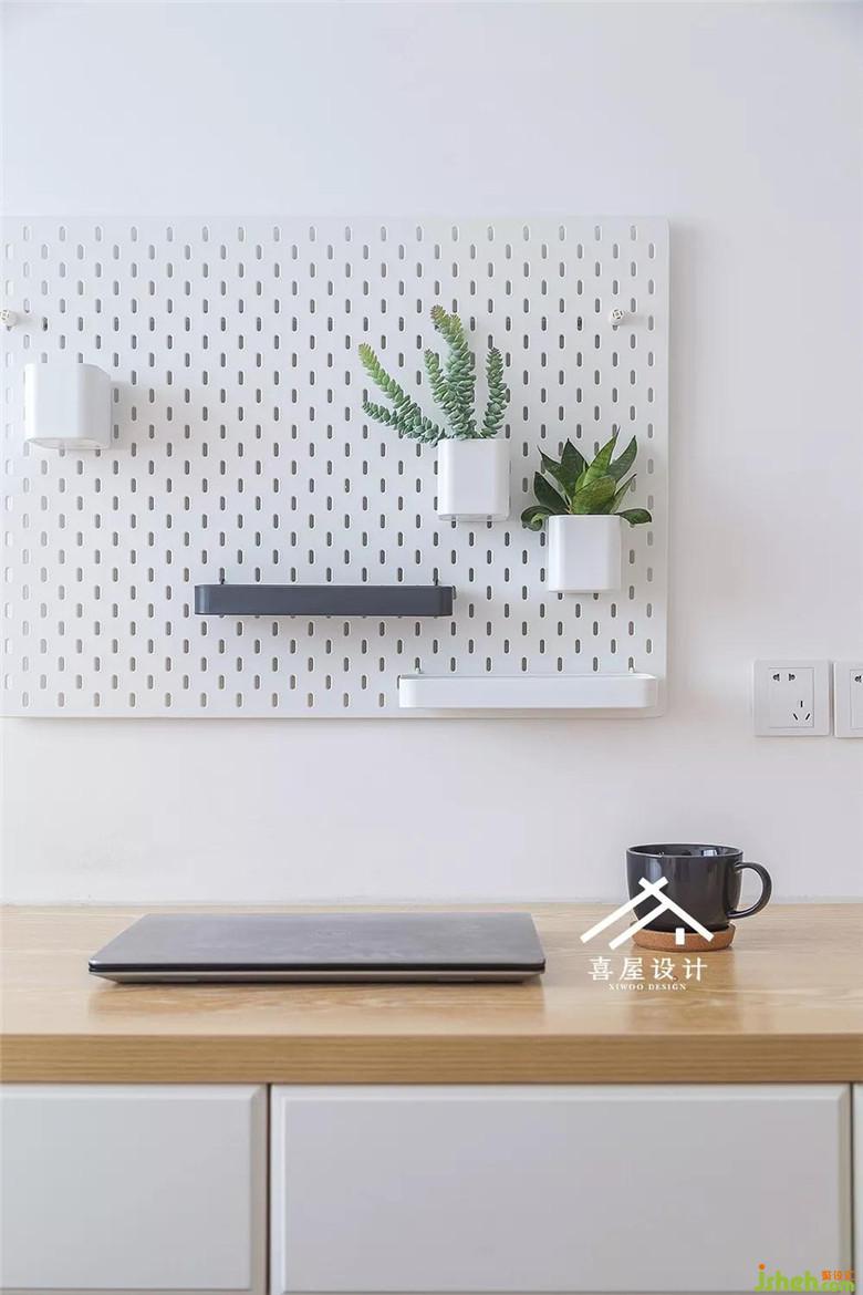 書房沿著飄窗做了榻榻米,下面可以儲物,書房墻面用了鏤空洞板子。在上面放一些小植物和用品。