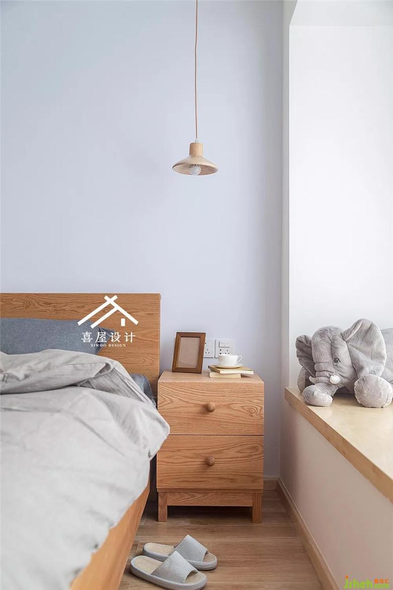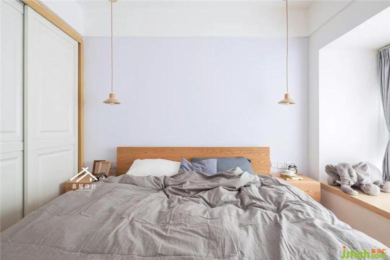 改寬以后的主臥室,剛好能放下1.8米的床和床頭柜,衣柜門做推拉的。床頭柜上方的兩盞吊燈,方便晚上的閱讀。