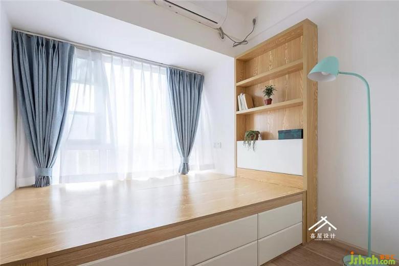 次臥室沿著飄窗做出來1.5米的榻榻米,利用原墻體空缺的地方做了隔板柜,相當于床頭柜的功能可以放一些隨手小物,而這些小物件的擺放,可以讓整體變得活絡(luò)起來。