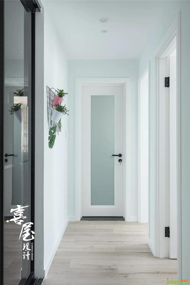 把原來進(jìn)深長的走廊做了1,8米的黑框廚房推拉門,增加廚房采光,也弱化了過道。每處門廊都能帶來陽光的驚喜。