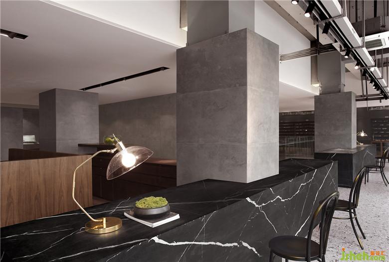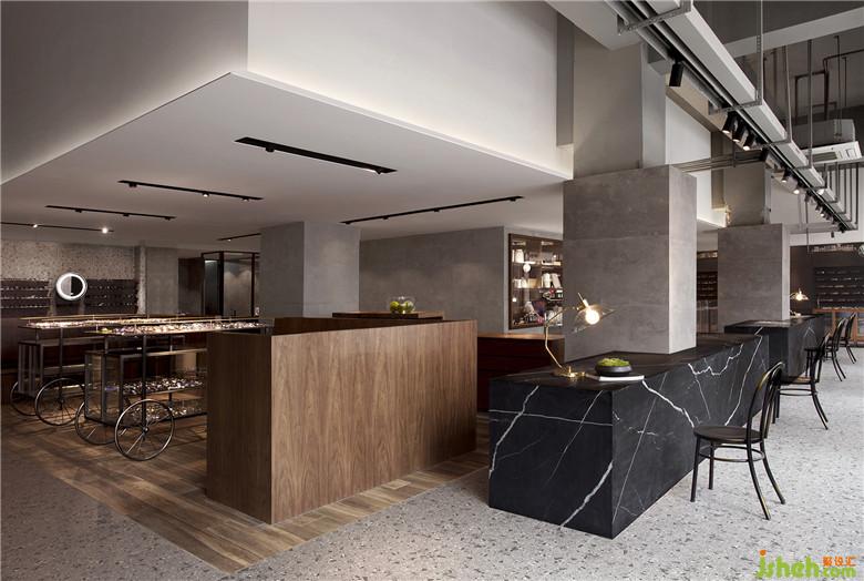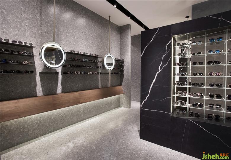 室內(nèi)設(shè)計師結(jié)合眼鏡的功能屬性抽離出幾種展示手法,固定墻面的黑鐵展架更好的襯托出眼鏡的主體地位,傳遞出陣列的美感。深色天然大理石和玻璃得組合更是暈染出一種精致優(yōu)雅的調(diào)性,金屬小車的造型不僅是對體塊的呼應(yīng),更給人帶來一種街頭售賣的感覺。