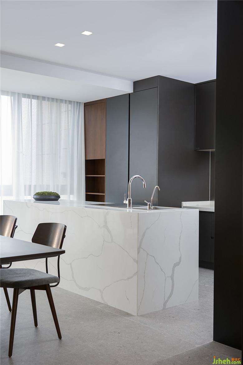 原先廚房的隔斷被拆除,從客廳白凈墻面到深色胡桃木的定制飾板和餐廳室內(nèi)設(shè)計師采用了同樣的深色胡桃木材質(zhì)的家具,再到廚房使用了深灰色帶有現(xiàn)代氣息的整體櫥柜和點綴的白色石材,營造清爽的氛圍,簡單、很有格調(diào),并將功能區(qū)清晰的劃分。