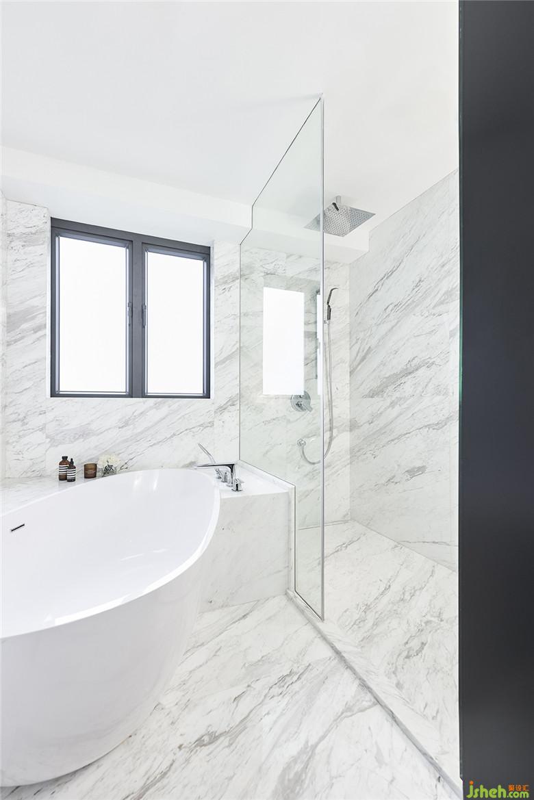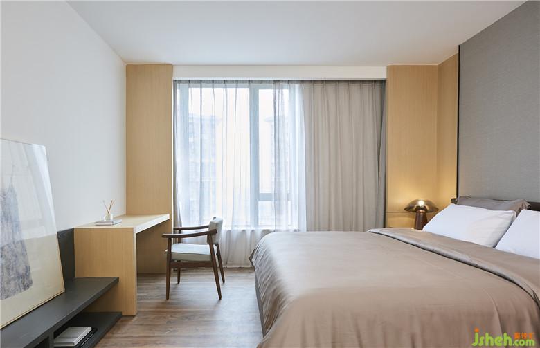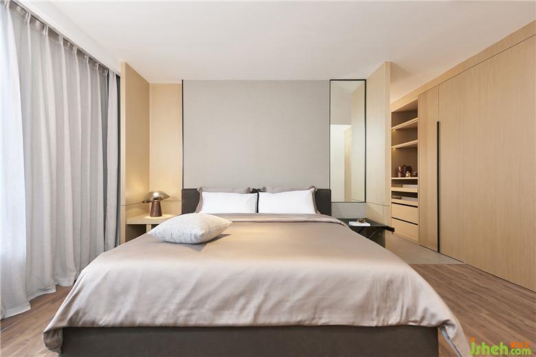 在主臥這間房內(nèi),室內(nèi)設(shè)計師完全沒有用到房門,就巧妙地串聯(lián)起房間內(nèi)休息區(qū)、衣帽間、主衛(wèi)這三個功能空間,這種簡潔巧妙的布局,使得三個空間的窗保持連續(xù)一致,將自然光和江景一同引入房間里,愜意極了。